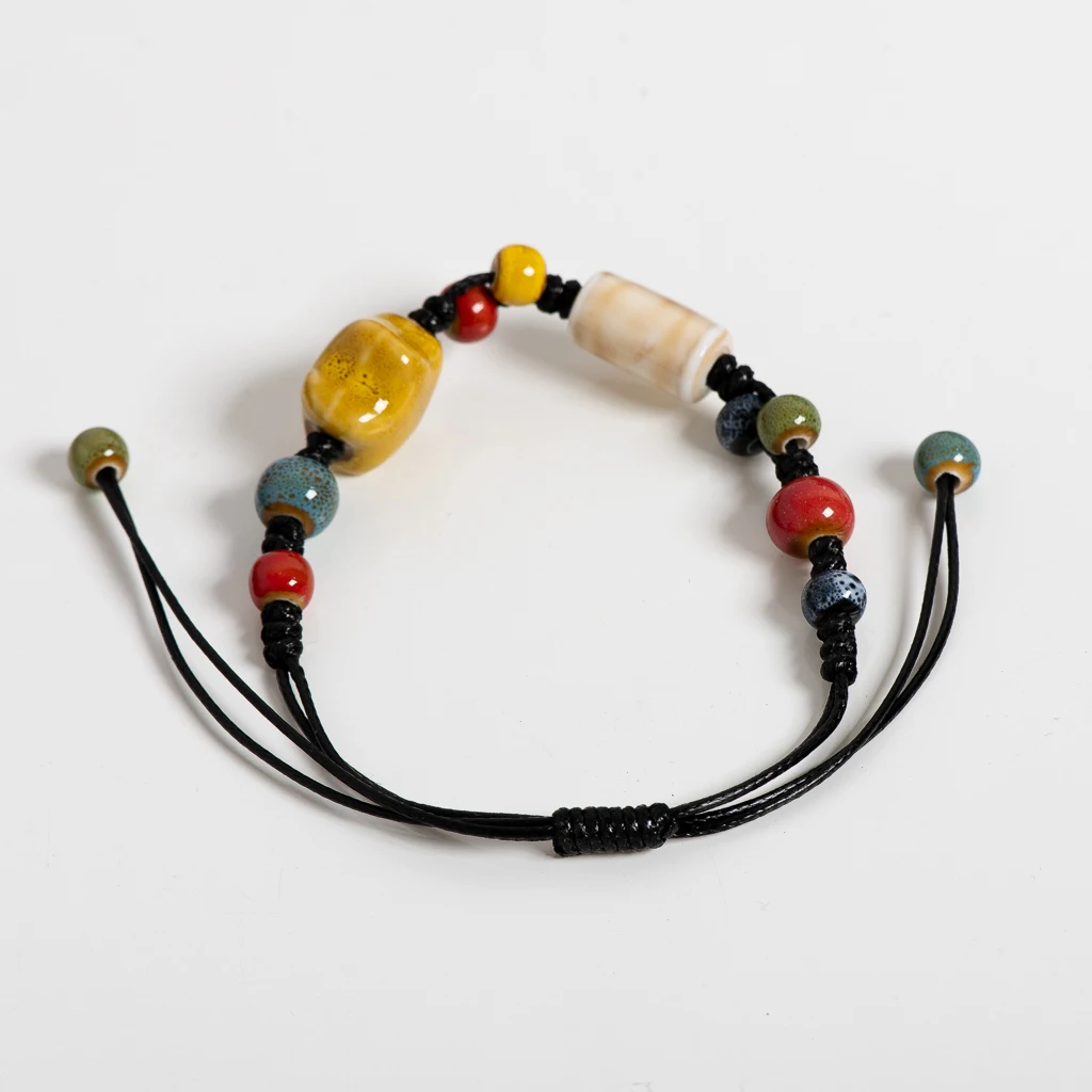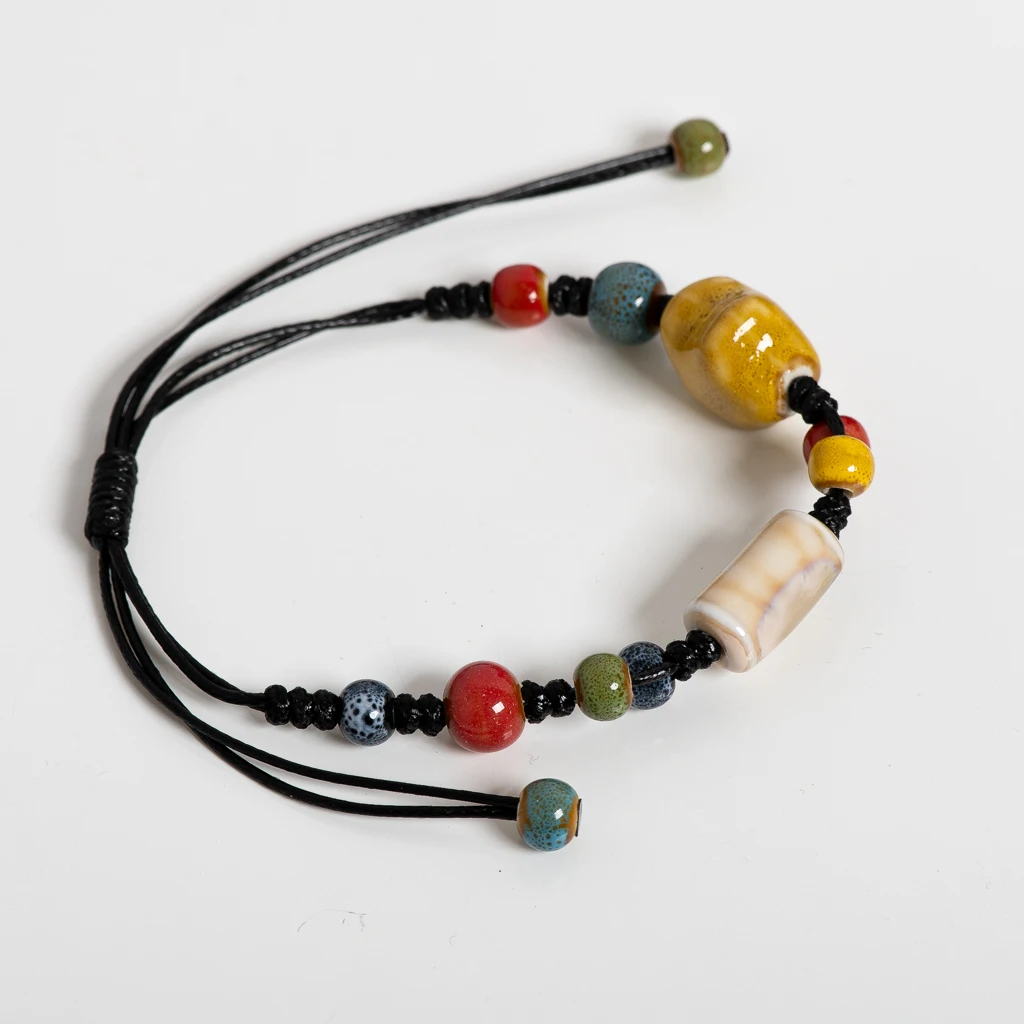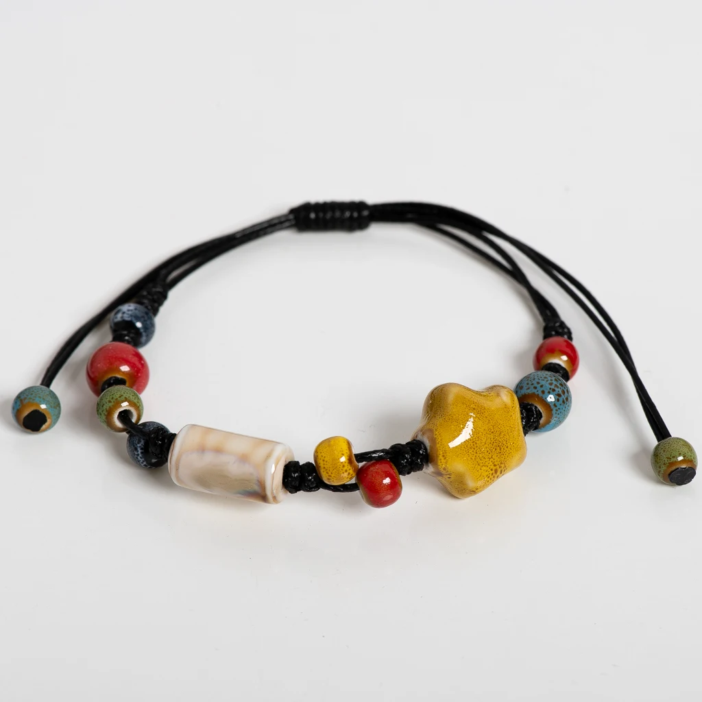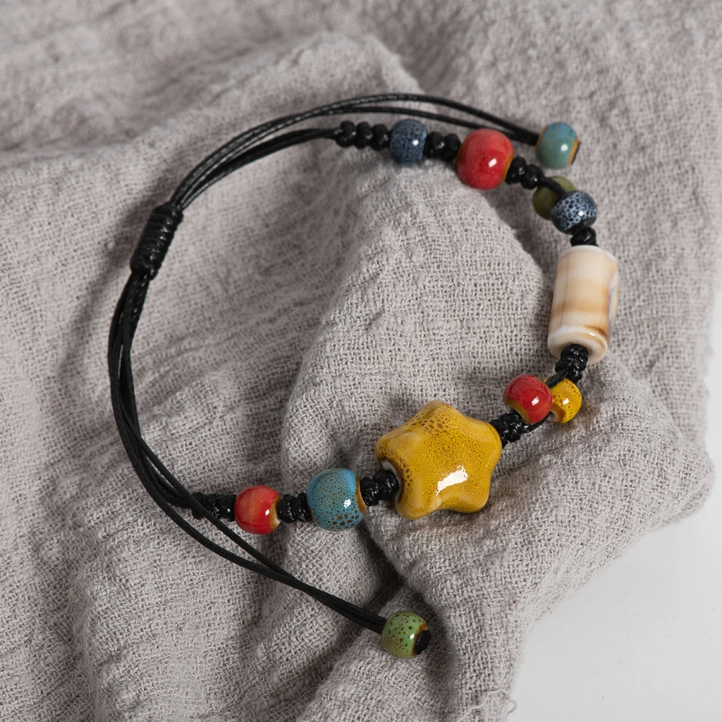 Amber Star Ceramic Bead Bracelet Adjustable 12–24cm Handmade Multicolor Boho Jewelry with Cord Knotting S02-061