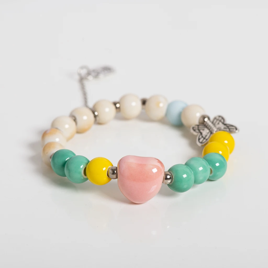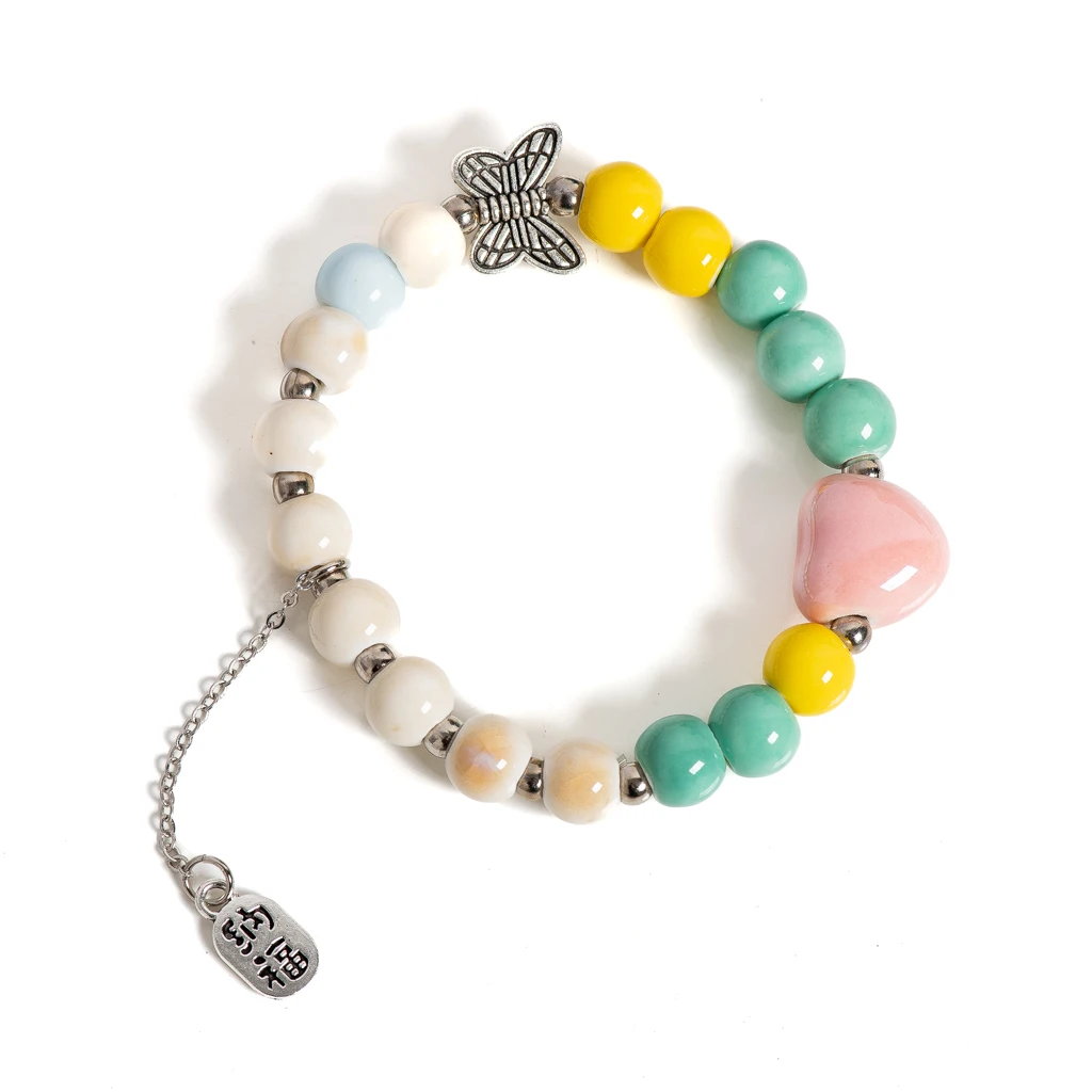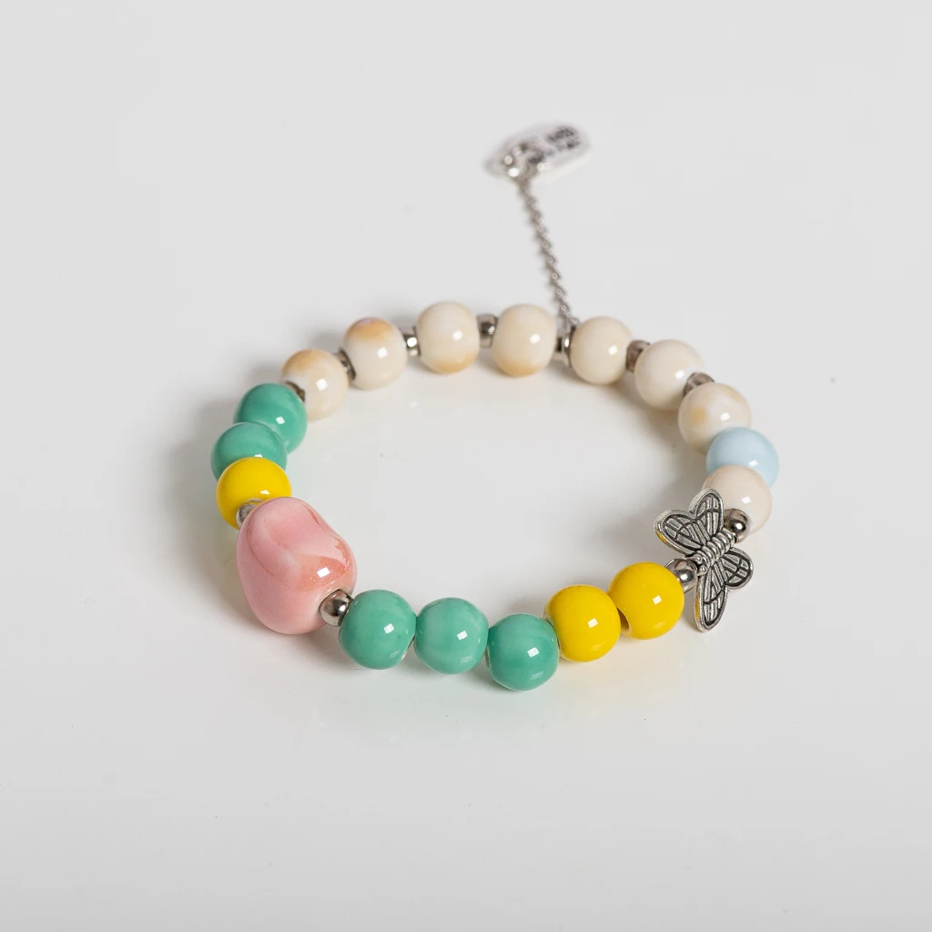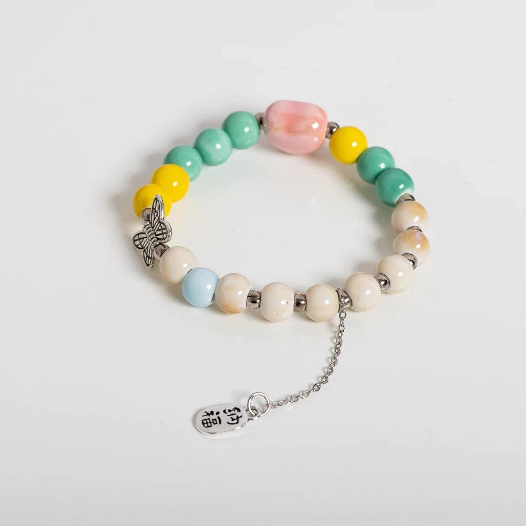 Colorful Ceramic Bead Bracelet with Butterfly and Blessing Charms 16–18cm Elastic Handmade Jewelry for Women S02-060