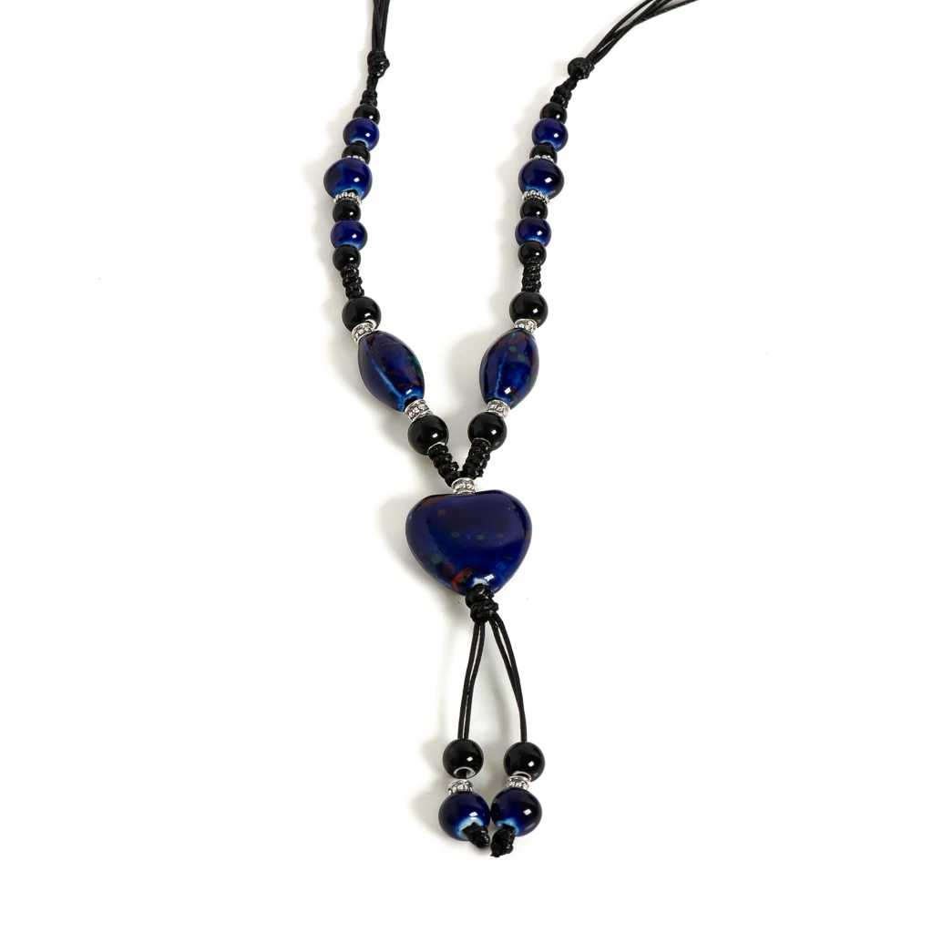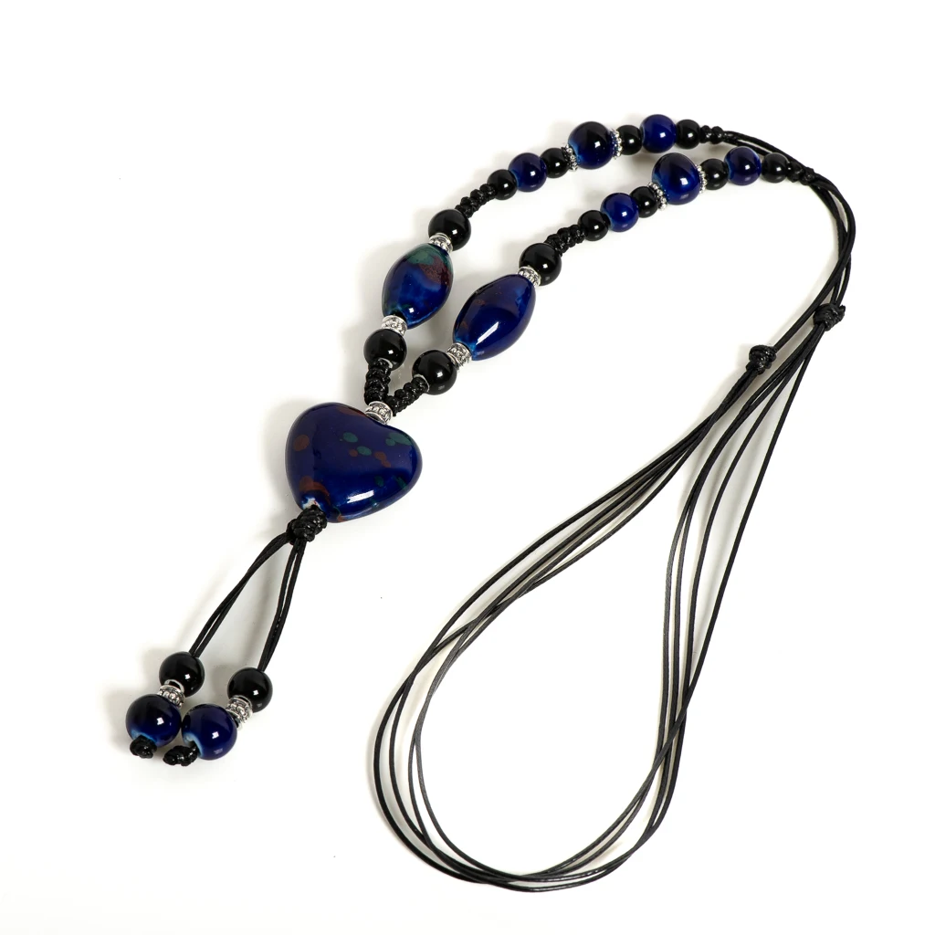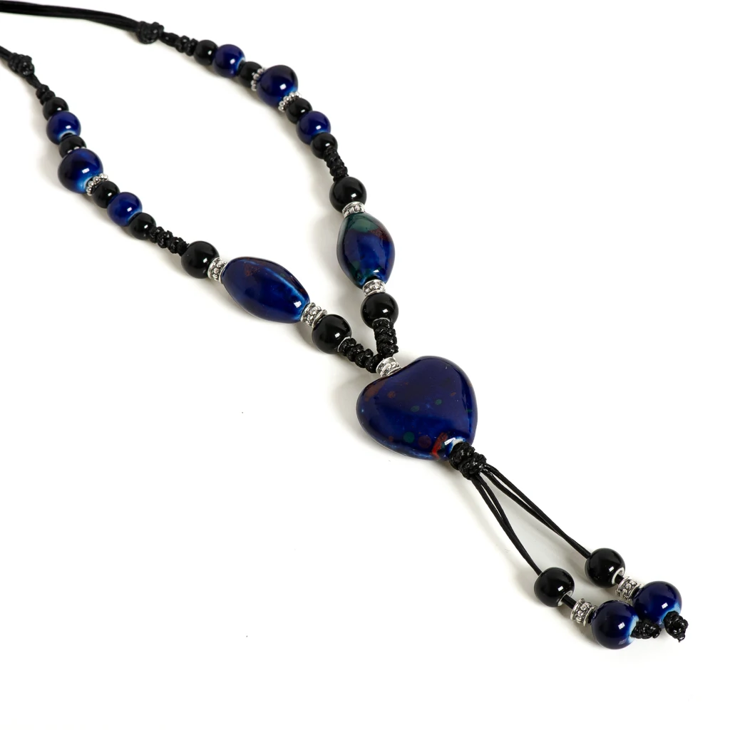 Handmade Purple Glaze Ceramic Heart Pendant Necklace for Women Adjustable Boho Ethnic Jewelry Long Statement Gift Accessory S001216