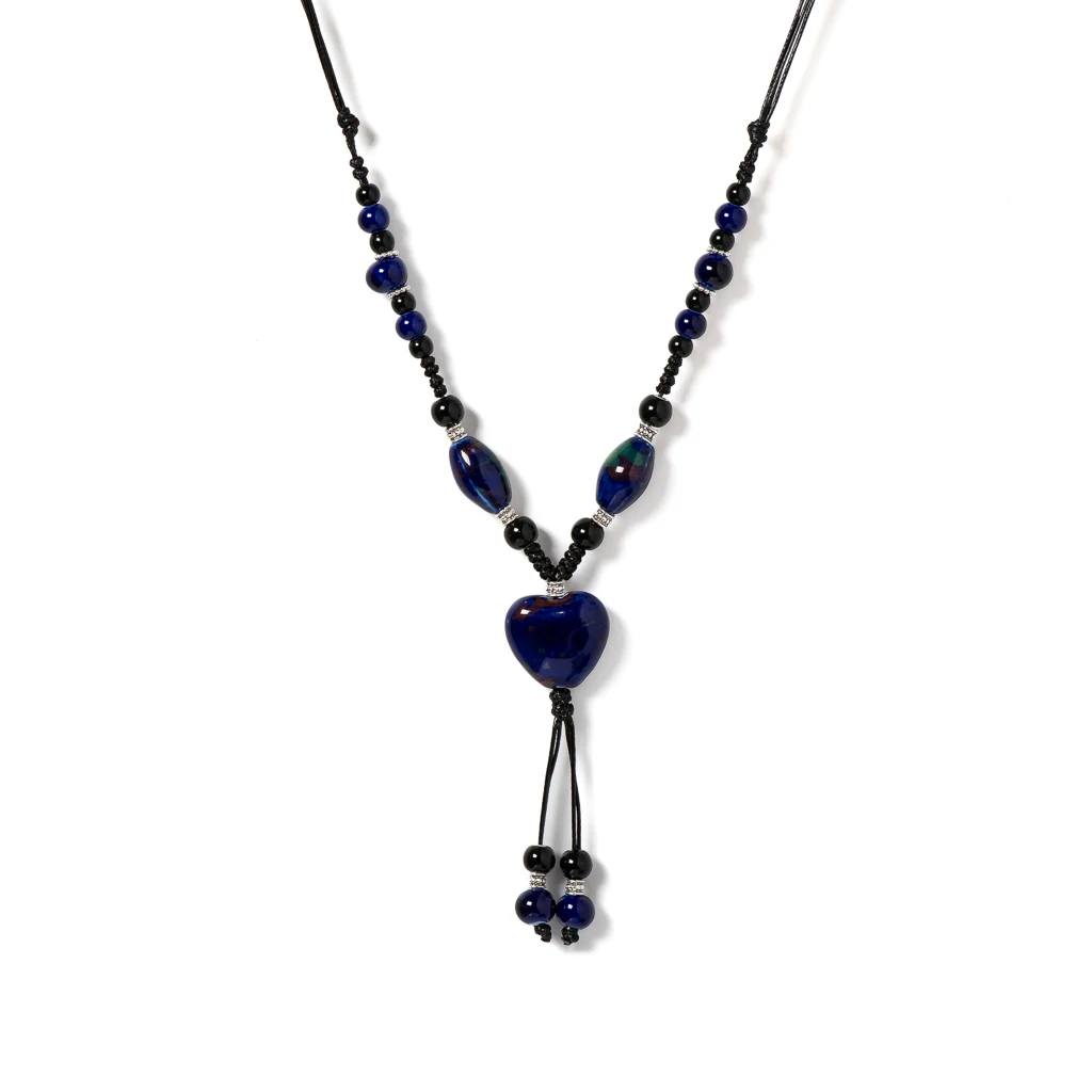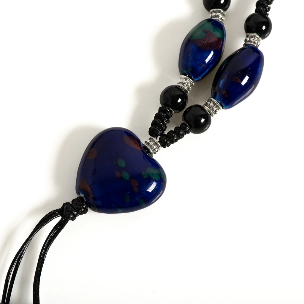 This handmade ceramic heart pendant necklace features a deep purple glazed finish that adds elegance and mystery to your look. The design showcases a bold heart-shaped bead, paired with smaller ceramic and alloy accents, all hand-strung on an adjustable waxed cord. Perfect for boho, vintage, or ethnic-inspired styles, it’s an ideal statement piece or heartfelt gift.