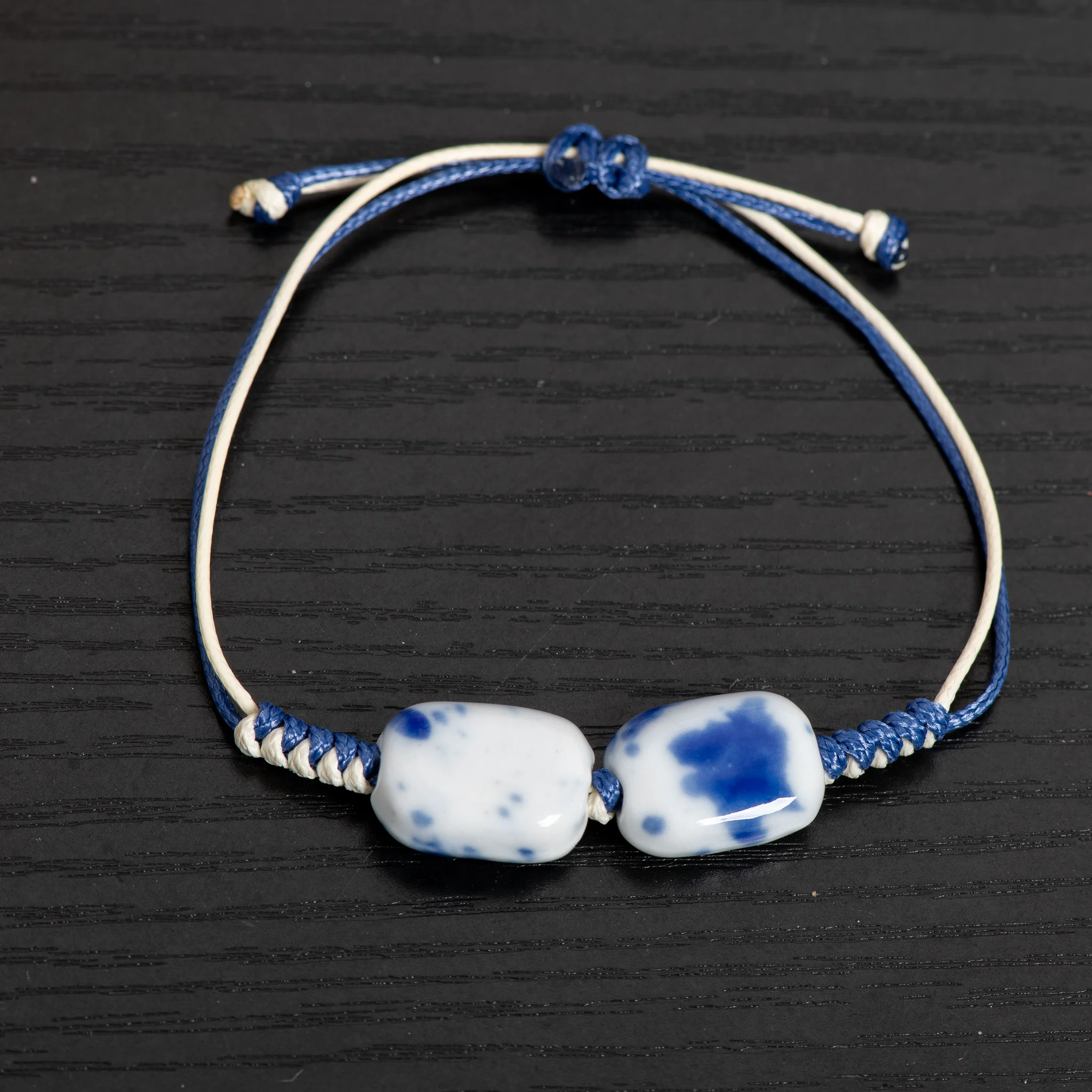 Handmade Blue and White Porcelain Beaded Bracelet Adjustable Boho Ceramic Jewelry Artistic Woven Wristband for Women Men S001187