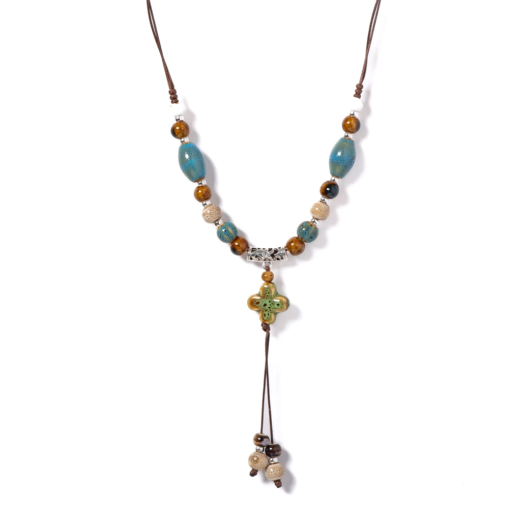 Handmade Boho Ceramic Beaded Necklace Adjustable Ethnic Jewelry Cross Pendant Long Layered Statement Necklace for Women S02-053