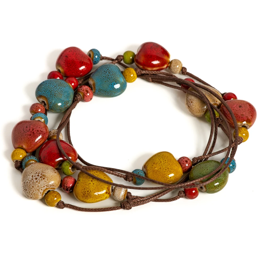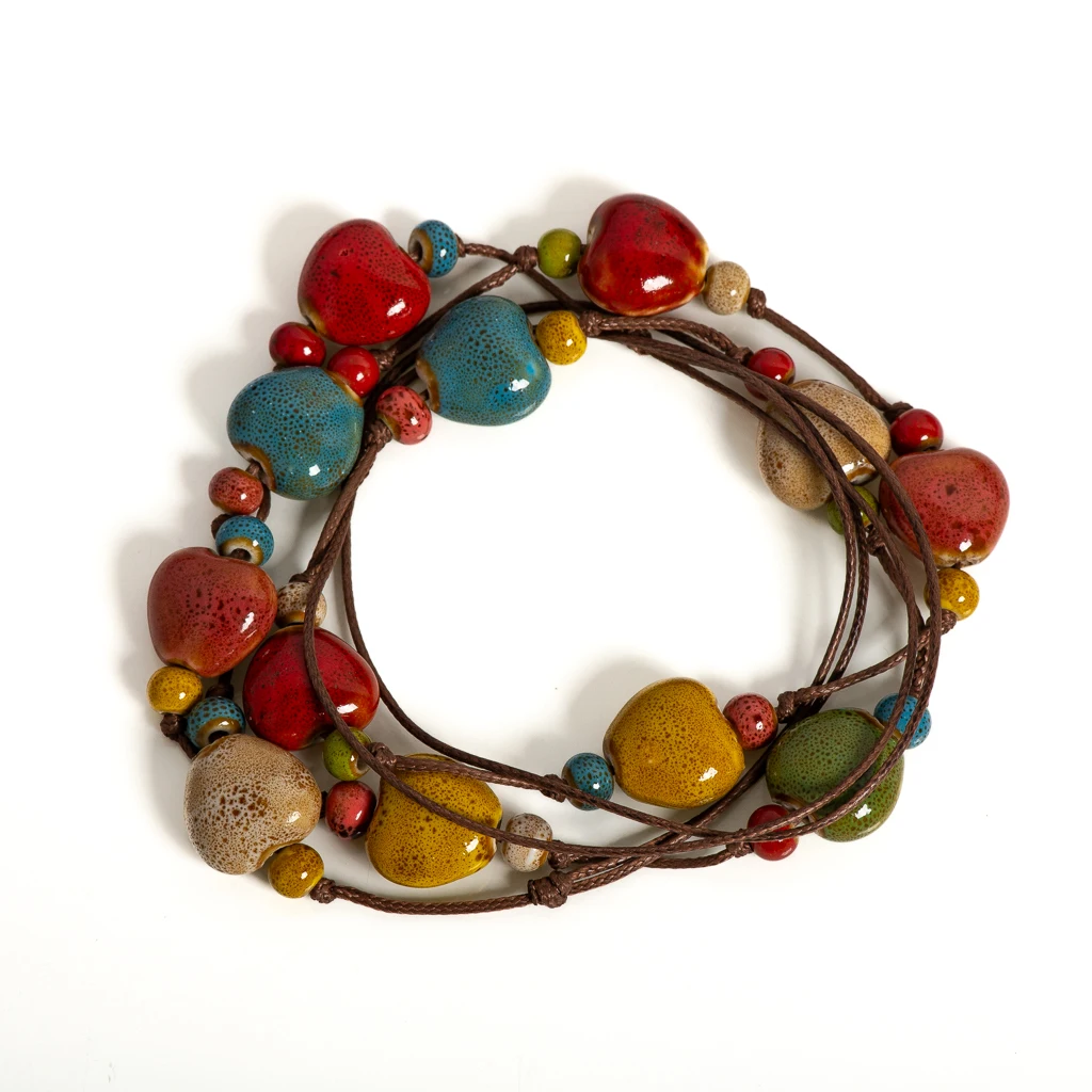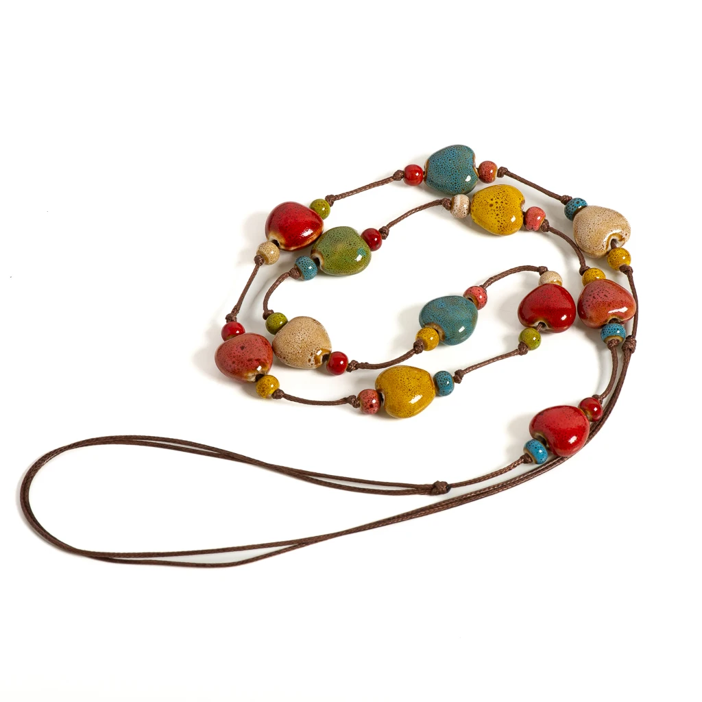 Handmade Ceramic Heart Bead Necklace for Women Adjustable Boho Jewelry Colorful Cord Statement Gift for Girls Ethnic Style S001215