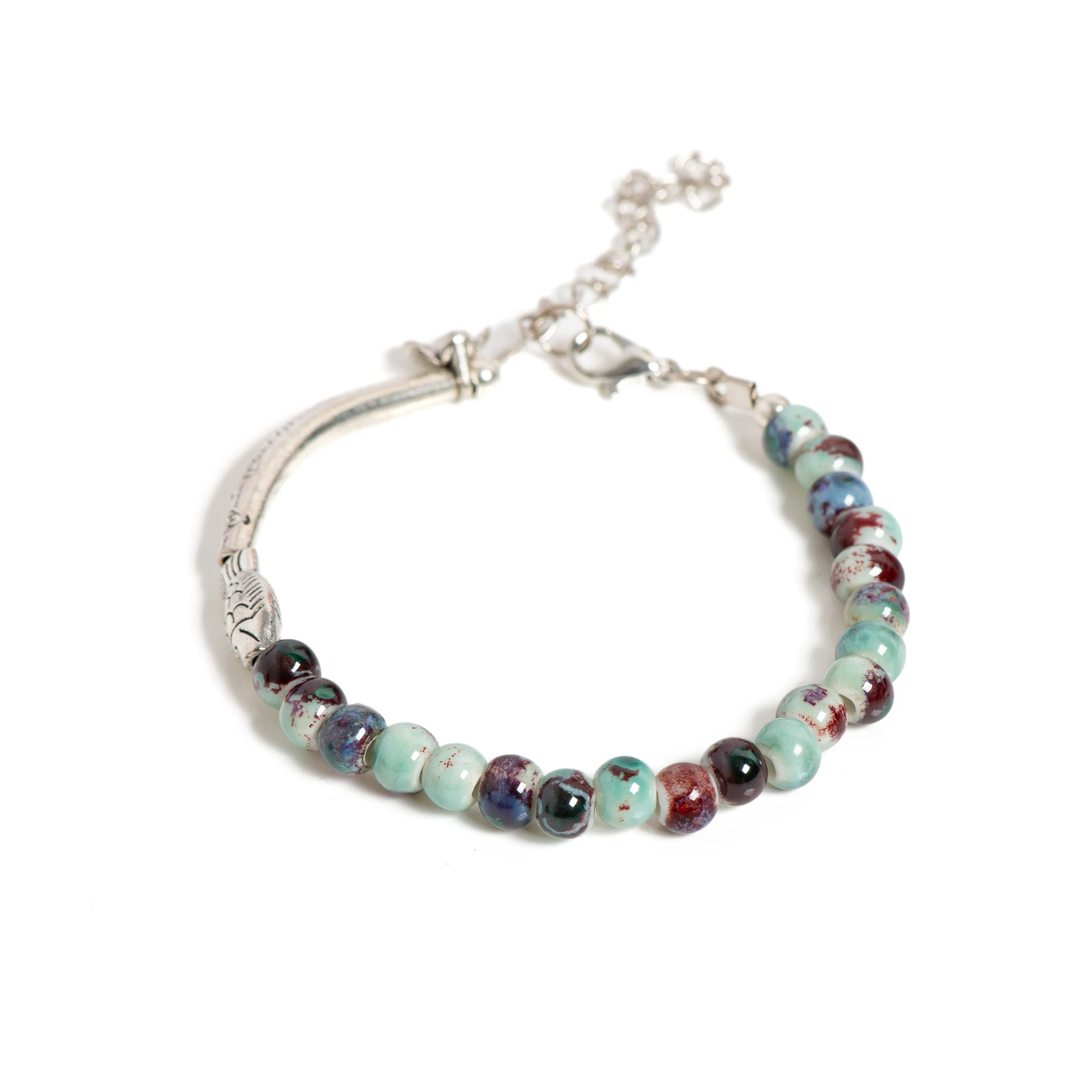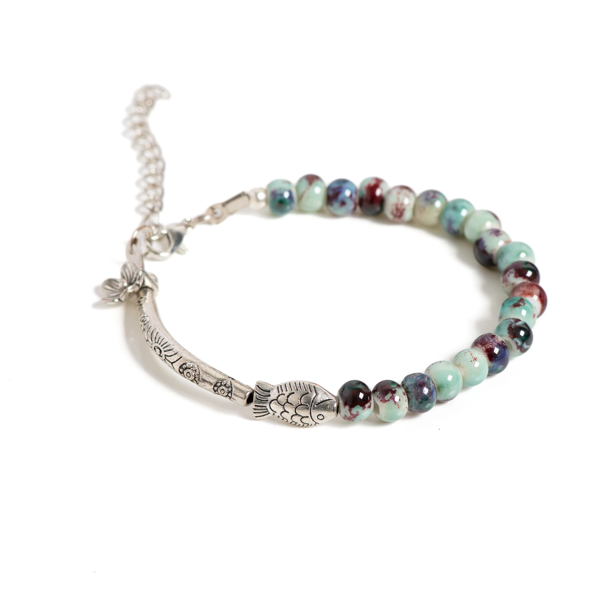This beautifully handcrafted ceramic bracelet blends delicate floral and fish motifs with a refined bohemian aesthetic. Featuring 6mm glazed ceramic beads in warm “Noble Drunk” tones, a silver-tone accent bar, and an adjustable fit (17cm-20cm), this bracelet offers both flexibility and elegance. Lightweight and intricately designed, it’s perfect for daily wear, layering, or as a thoughtful handmade gift.