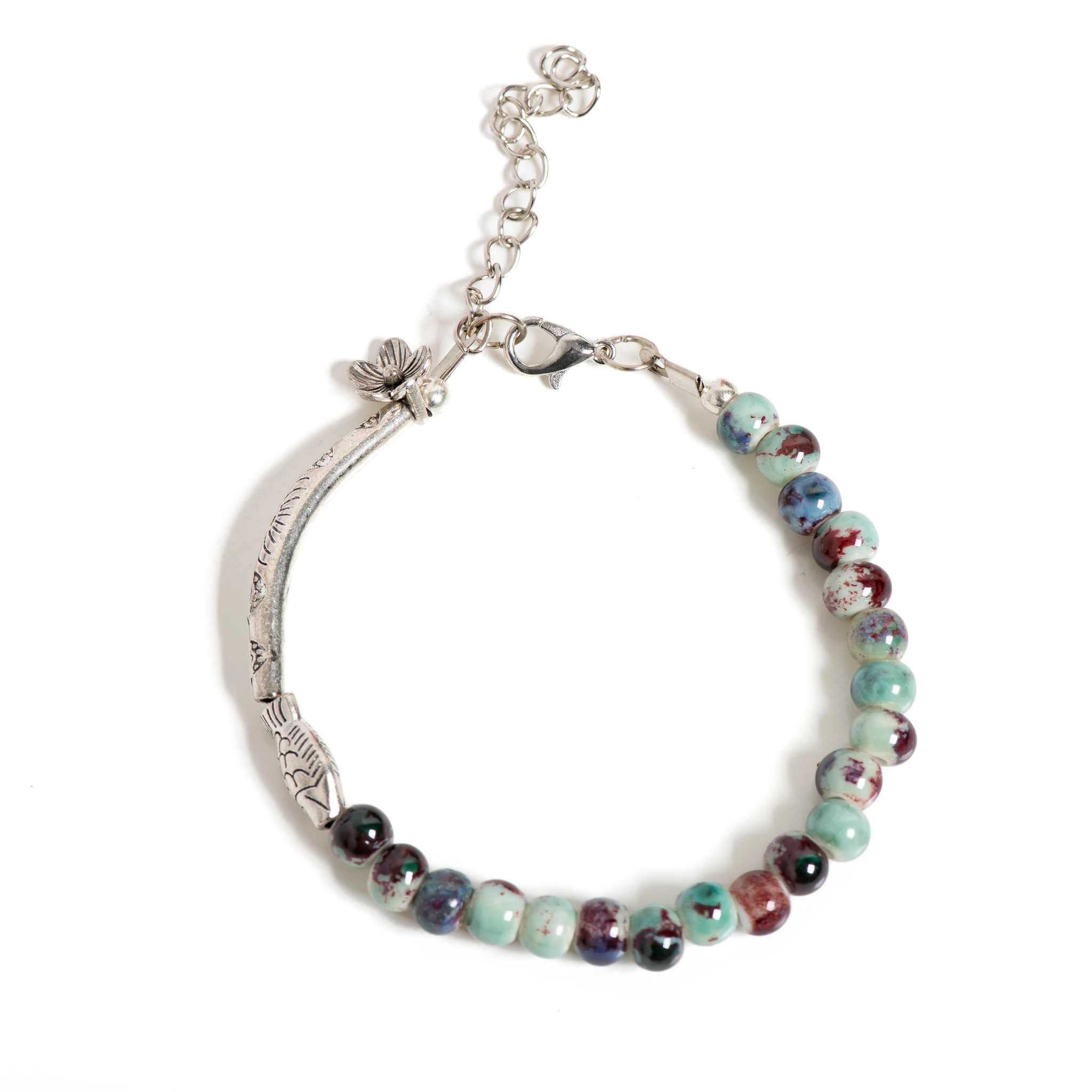 Handmade Floral Fish Ceramic Beaded Bracelet Adjustable Boho Elegant Jewelry with Silver Accents for Women S001188