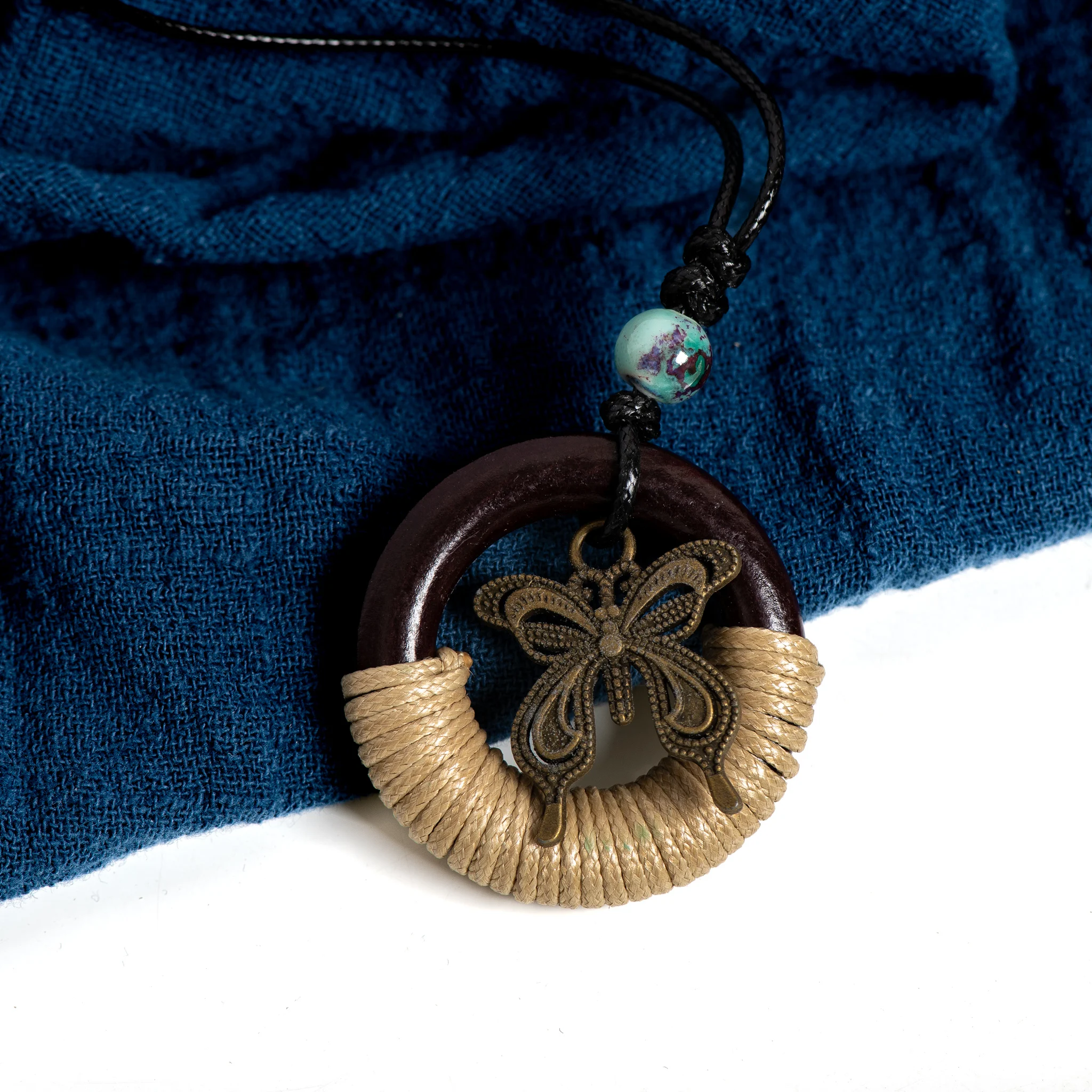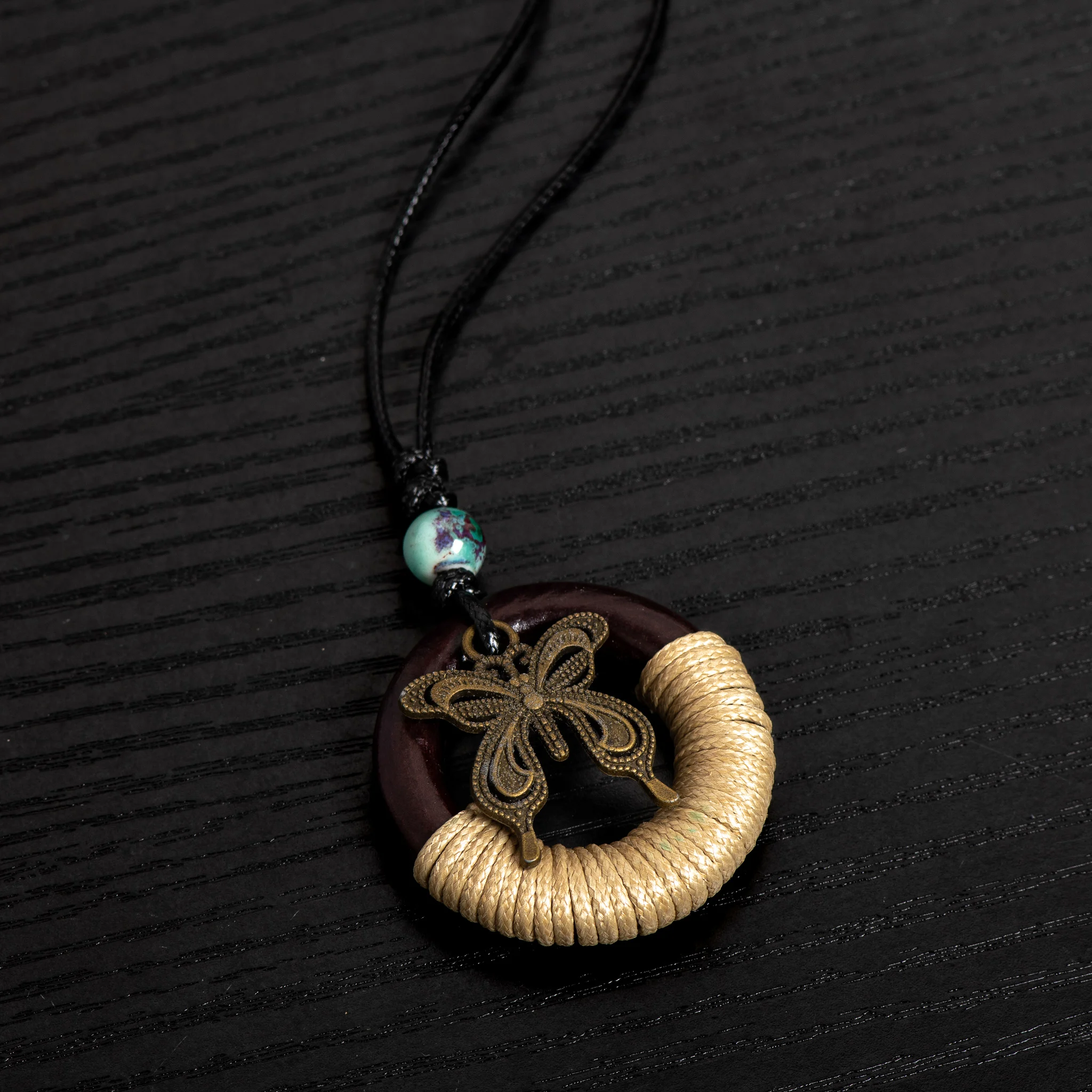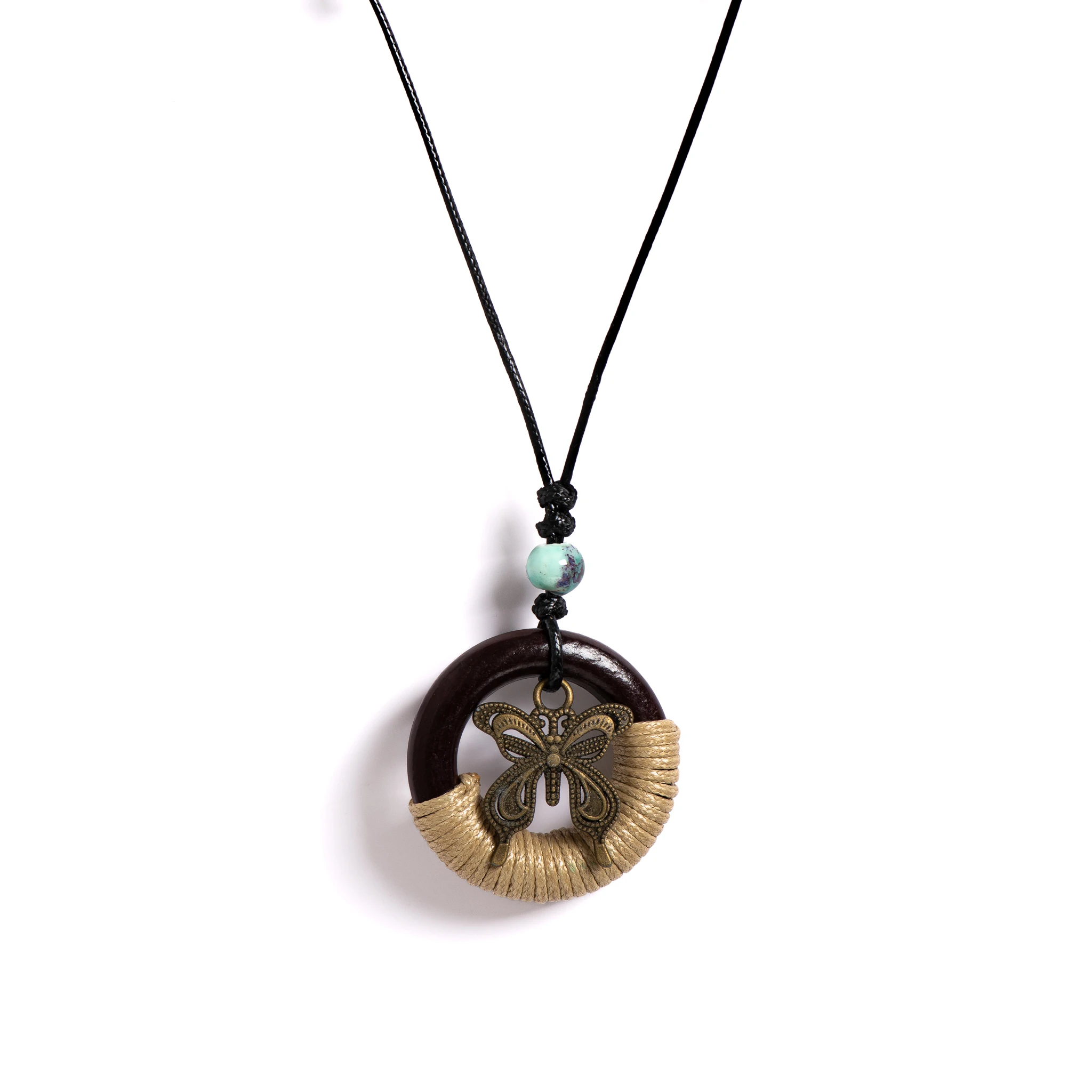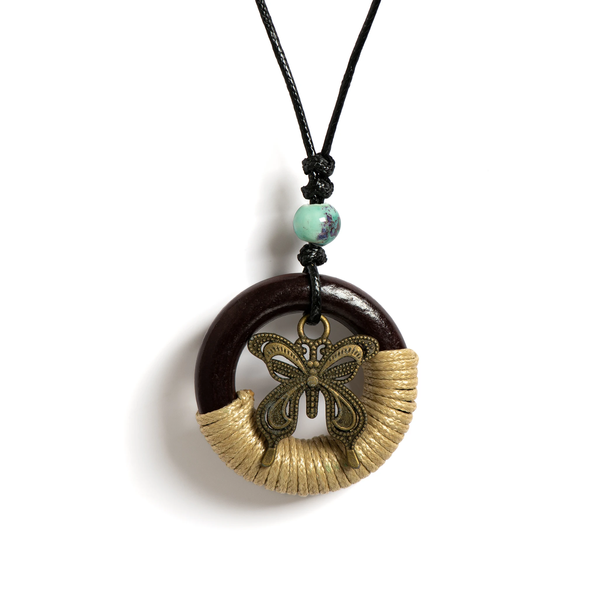 Rustic Wooden Circle & Butterfly Pendant Necklace Handcrafted Ceramic Beaded Adjustable Boho Vintage Jewelry for Women S001194