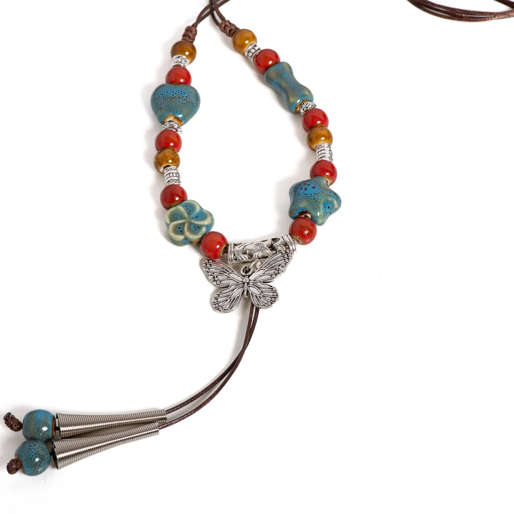 Handmade Colorful Butterfly Ceramic Necklace Adjustable Boho Ethnic Jewelry Tassel Pendant Long Statement Necklace for Women S02-054
